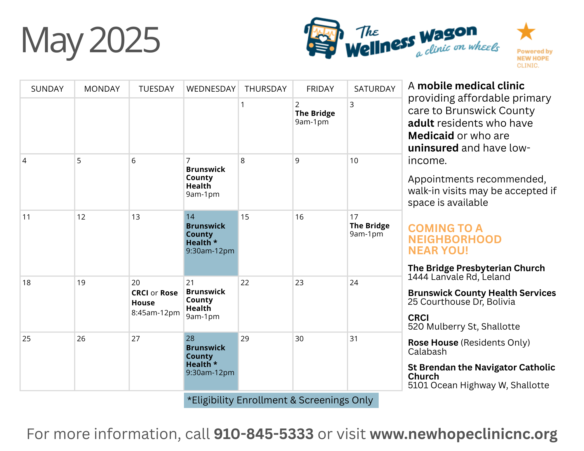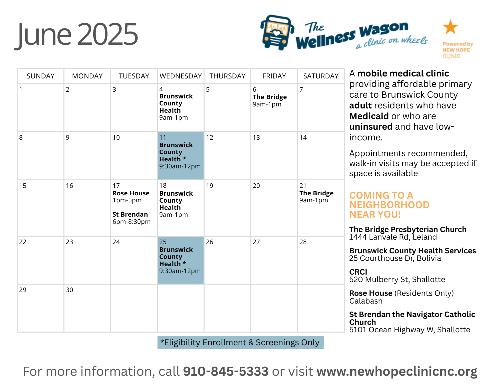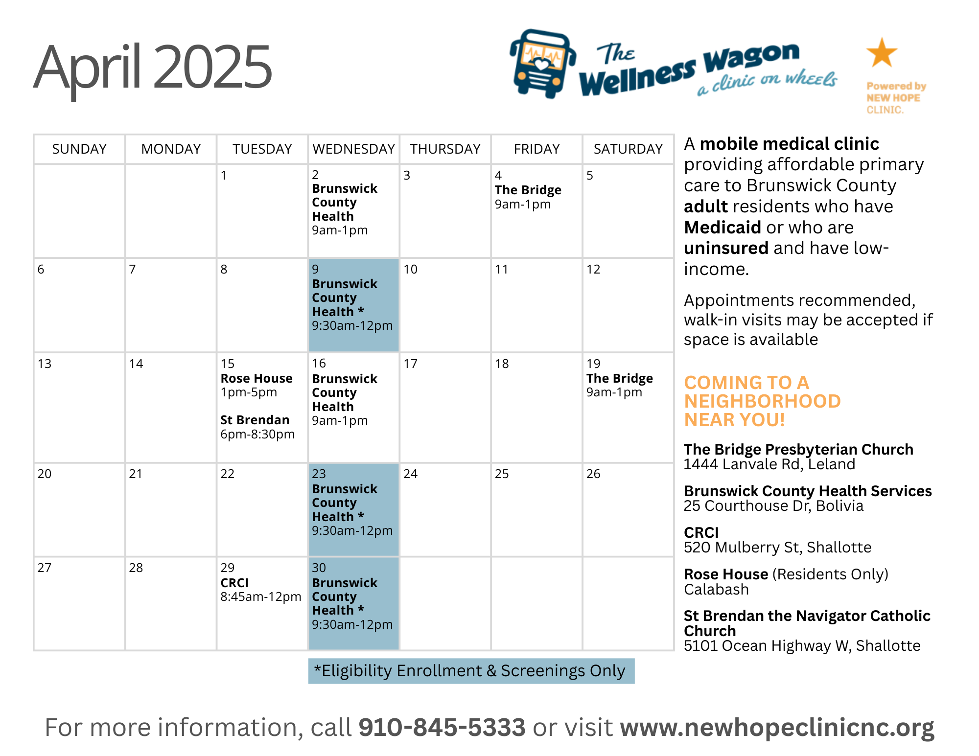 New Hope Clinic is committed to providing affordable healthcare and wellness services for adult residents of Brunswick County, North Carolina.